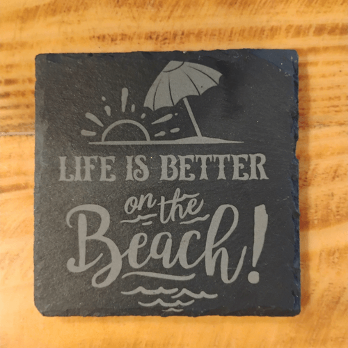 “Life is Better on the Beach” slate coasters bring coastal charm to any space.