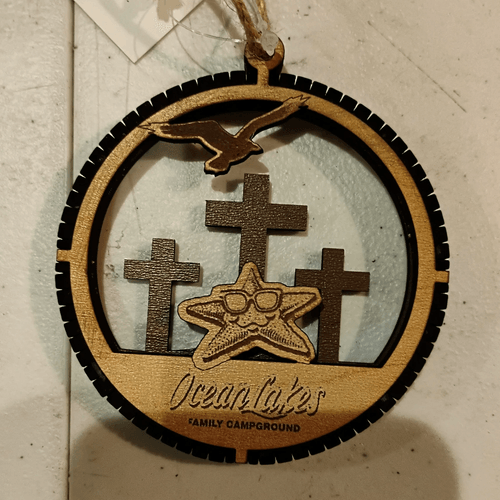 Capture the spirit of your favorite beach get away with this charming Ocean Lakes ornament keepsake. Featuring three crosses symbolizing faith and peace, and the iconic Sandy the Star, this ornament is a heartwarming reminder of sun-soaked days, family traditions, and cherished memories made by the sea.