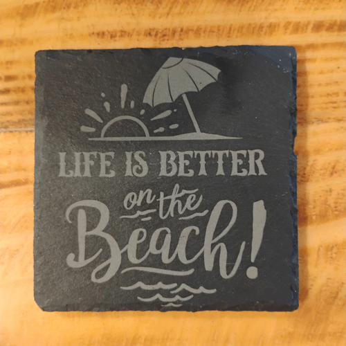 “Life is Better on the Beach” slate coasters bring coastal charm to any space.